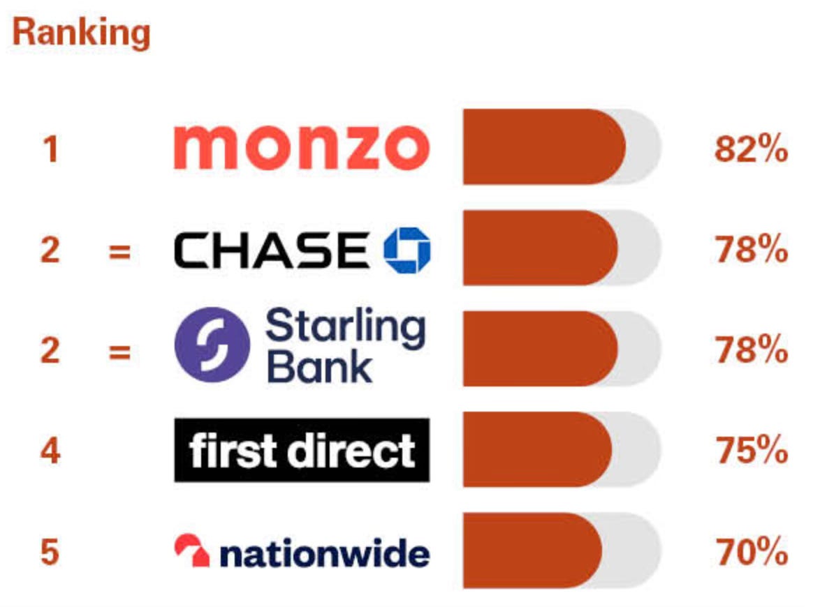 The Ipsos twice-yearly ranking asks customers how likely they'd be to recommend their bank to friends or family. In the latest results, Monzo scored 82%, with Chase and Starling Bank joint second at 78%. Since 2020, Monzo has led or come joint top almost every time. They also topped the latest YouGov customer satisfaction survey.