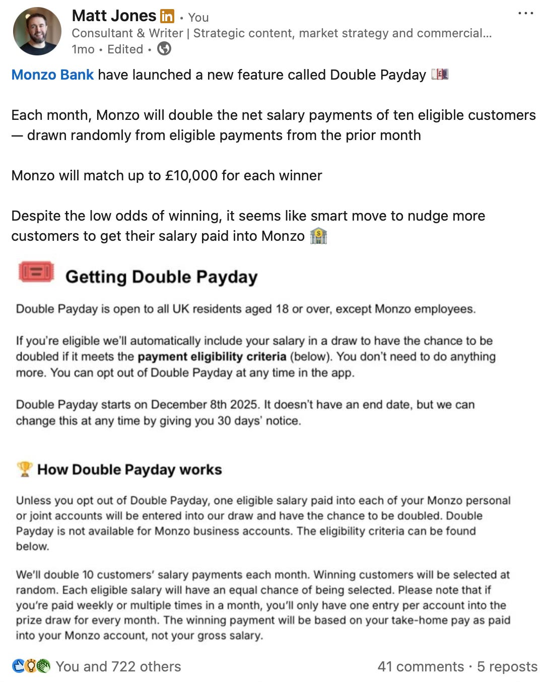 This isn’t the first time that Monzo has taken this approach of rewarding customers with a giveaway. Double Payday was launched at the end of last year and generated lots of publicity for the bank. There are still many customers who use Monzo — and other neobanks — as their second bank, such as for tracking expenses, when spending money abroad, or to make payments easily. Double Payday is a way to nudge customers to pay their salary into Monzo, and to use it as their main bank account.
