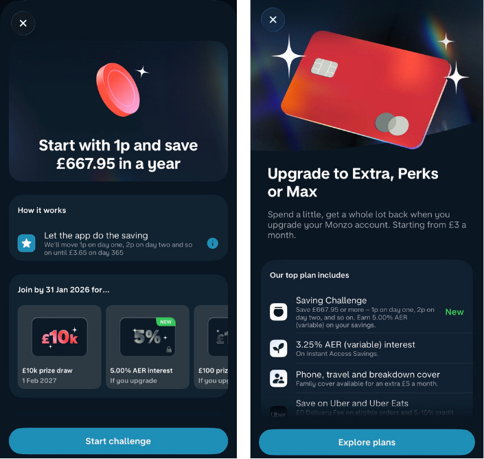 At the start of each year Monzo publicises the 1p Saving Challenge. The idea is simple. Users save 1p on the first day of the year, 2p on the second day of the year, 3p on the third and so on. If a customer signs up on January 1st and continues throughout the year, after the addition of £3.65 on the last day of the year, they’ll have saved a total of £667.95 (before any interest).